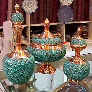 | Turquoise does not have a long history in Iranian handicrafts. At first, turquoise was used on bracelets, brooches, earrings, etc. Other than decorative jewelry, turquoise is used on plates, tumblers, watering cans, flowerpots, candlesticksˇK |