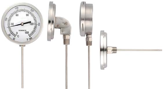 Dial diameter: 1?; 2"; 2?; 3"; 4"; 5"; 6" Case: Stainless steel 304 case, IP65 Lens: Glass lens Measuring principle: Coiled bimetal Connection: stainless steel 304 standard stainless steel 316 available Thread: male thread 1/4?or 3/8" or 1/2" PT(BSPT) / NPT Stem: Stainless steel 304 standard, stainless steel 316 available Stem length: 2?~ 50?by order Stem diameter: 6.35mm (1/4? standard; 4mm, 8mm, 9.5mm, 12mm available Accuracy: +/-1% F.S. Ranges: From -50 to +600 deg. C available