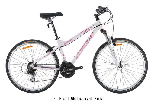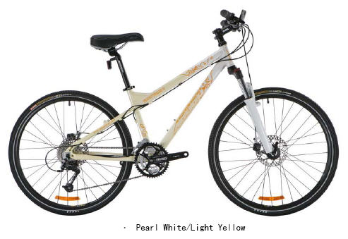 "15 inch & 17 inch, Alloy 6061 Frame ¡@ 17 inch, 13.4 Kgs Features: - Suitable for commuter or sport enthusiast - Outstanding head tube shape by CNC machined - Equipped with Shimano 11-34 ration Teeth, energy-saving when mountain climbing - Kenda K-1029 tire with reflector strip - Shimano crank, brake/shift lever, front/rear derailleur Color Optional - Pearl White/Light Pink - Pearl White/Light Blue
