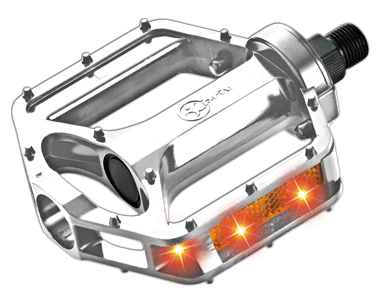 Body: Aluminium Axle:Carbon Steel Reflector: CATEYE Wheel Size:105 m/m x 99 m/m Packing:Box packaging OR Blister packing" "Flash LED Lighted bicycle pedal - Silver Features: - Made in aluminum:Used for regular MTB bike. -Build in generator. Side light for added visibility, six Flash LED lights for each - No battery needed Flash LED lighting pedal -Easy Installation