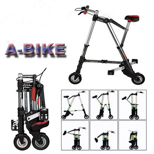 Features: 1) Folding A-bike is incredibly small and you can take it on public transport that has a no-bicycle policy; 2) Folding A-bike only weighs approximately 5.6 kg (12.6 lbs); 3) Folding A-bike utilizes automotive grade, engineering polymers for its structural components, saddle and handlebars and has a level of stiffness, fatigue & impact resistance comparable with aero-grade aluminum; 4) Folding A-bike also has a highly efficient, two-stage chain transmission that incorporates a high quality freewheel and is totally enclosed to protect clothing from grease; 5) Folding A-bike also has very small pneumatic tires that, based on recent valve developments, offer an extremely comfortable ride. The tire's inner tubes can be removed and repaired in the same way as a larger bicycle tire; 6) Folding A-bike can be folded inside 10 seconds into a compact 67 x 30 x 16 cm package.