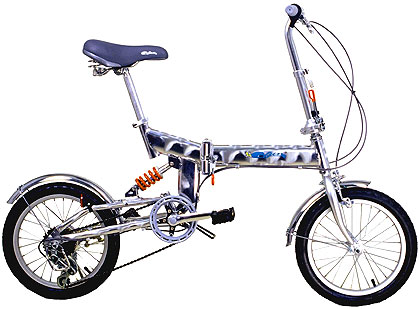 Type: All-Purpose , Frame: 16" Aluminum alloy folding , Freewheel: Shimano , Tire Tube: 16" x 2.125 black , Brake: Front brake steel-chrome plated, Rear/band brake ,steel-chrome plated , Derailleur: Shimano , Chainwheel: Steel-chrome plated 1/2" x 1/8 , Handlebar: Alloy , Handlebar Grips: Gray , Saddle: Spring loaded, gray , Suspension: Frame suspension spring , Fender: Front and Rear , Folded Size: 32.5" x 13.5" x 22" , Weight: 28.7 lbs. (13.0kg) . |